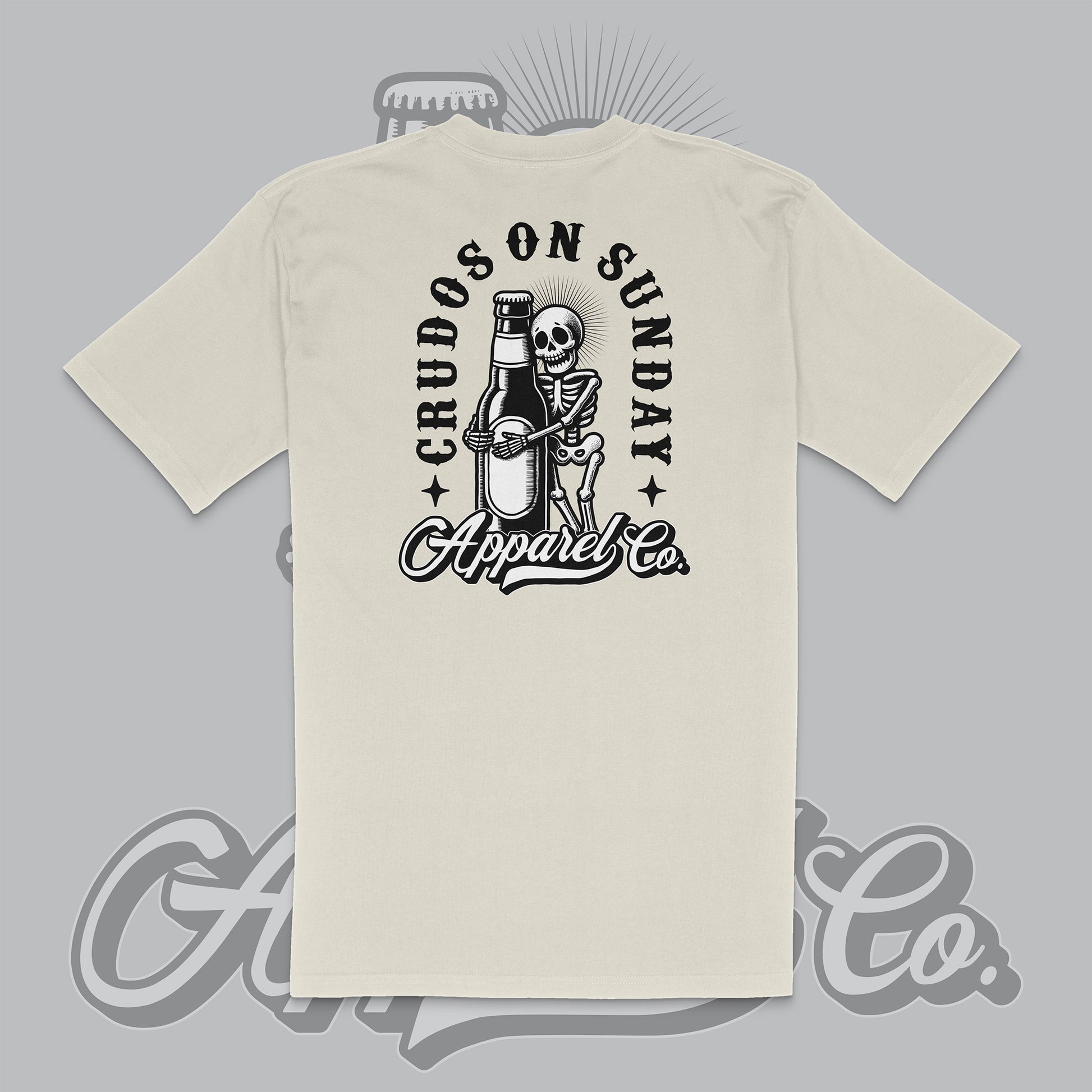 He’s been through it — and you probably have too. El Compita Crudo brings that Sunday mood to life with bold art and a sense of humor only the real ones get. Featuring a skeleton clutching a beer bottle like it’s his last lifeline, this tee is a tribute to those long nights and longer mornings.